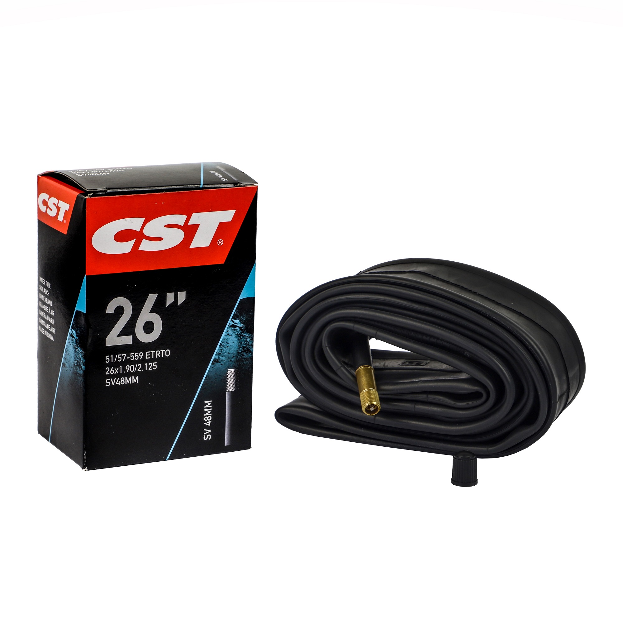 Cámara CST para llanta de 26″ de un ancho variable entre 1.90 y 2.125 válvula Schrader 48 mm.
